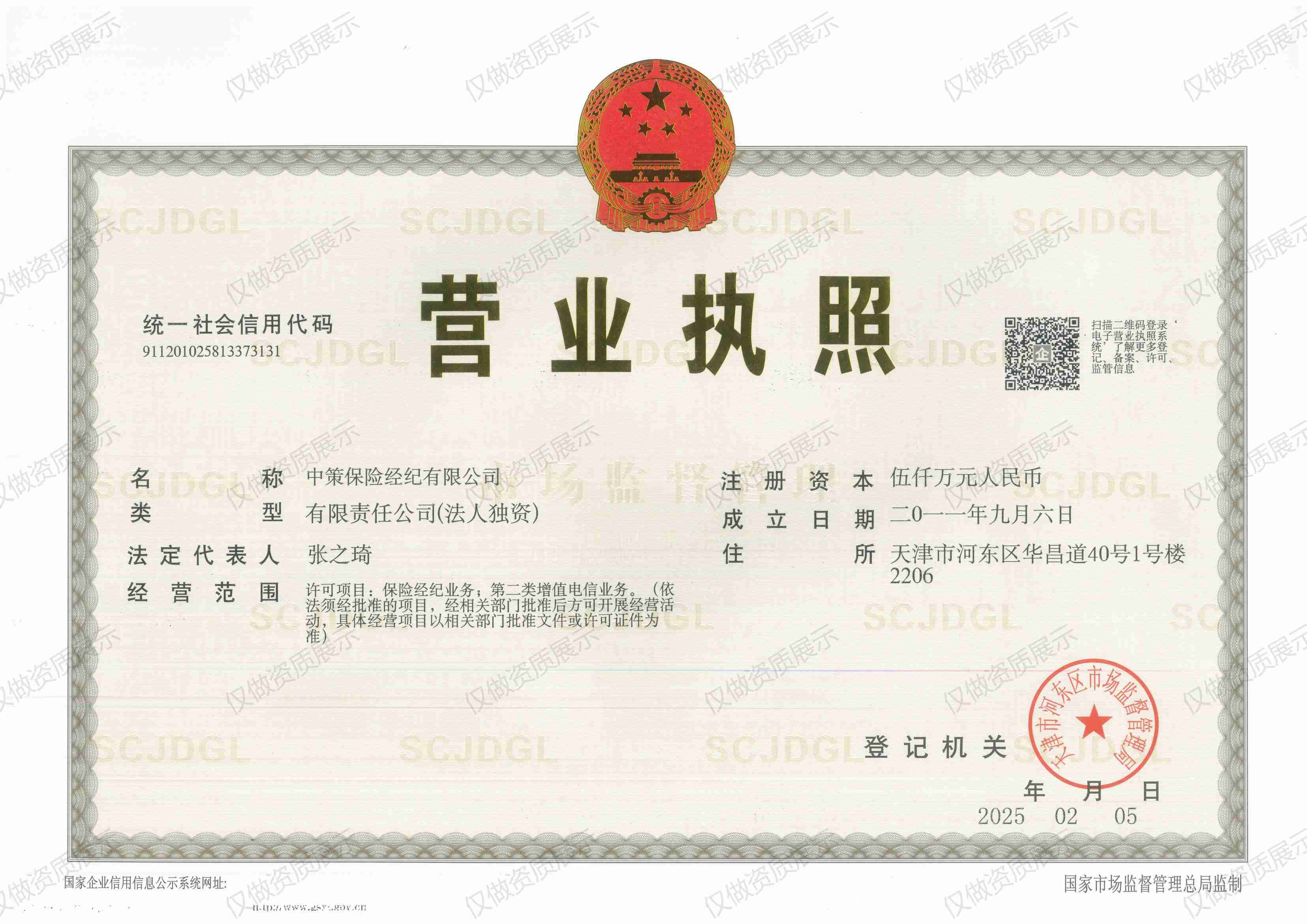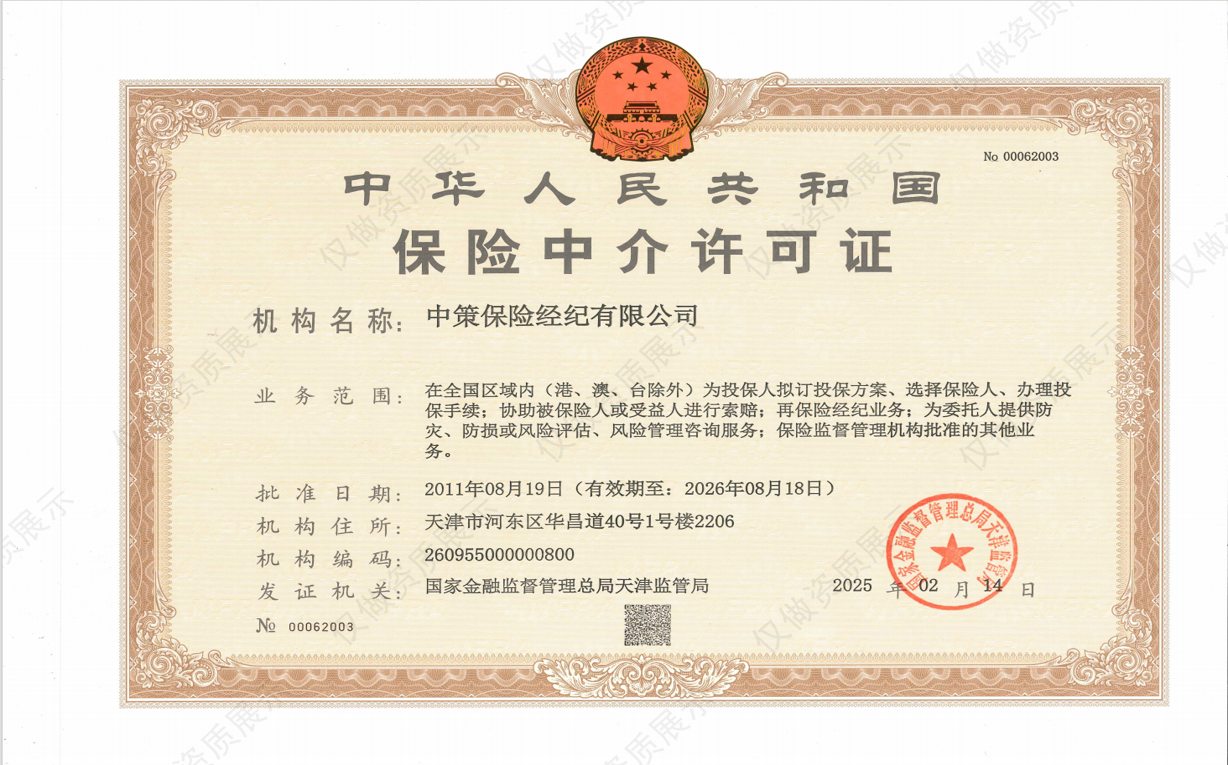 中策保险经纪有限公司已于2023年7月27日完成了《保险中介许可证》的换发,新许可证信息如下: